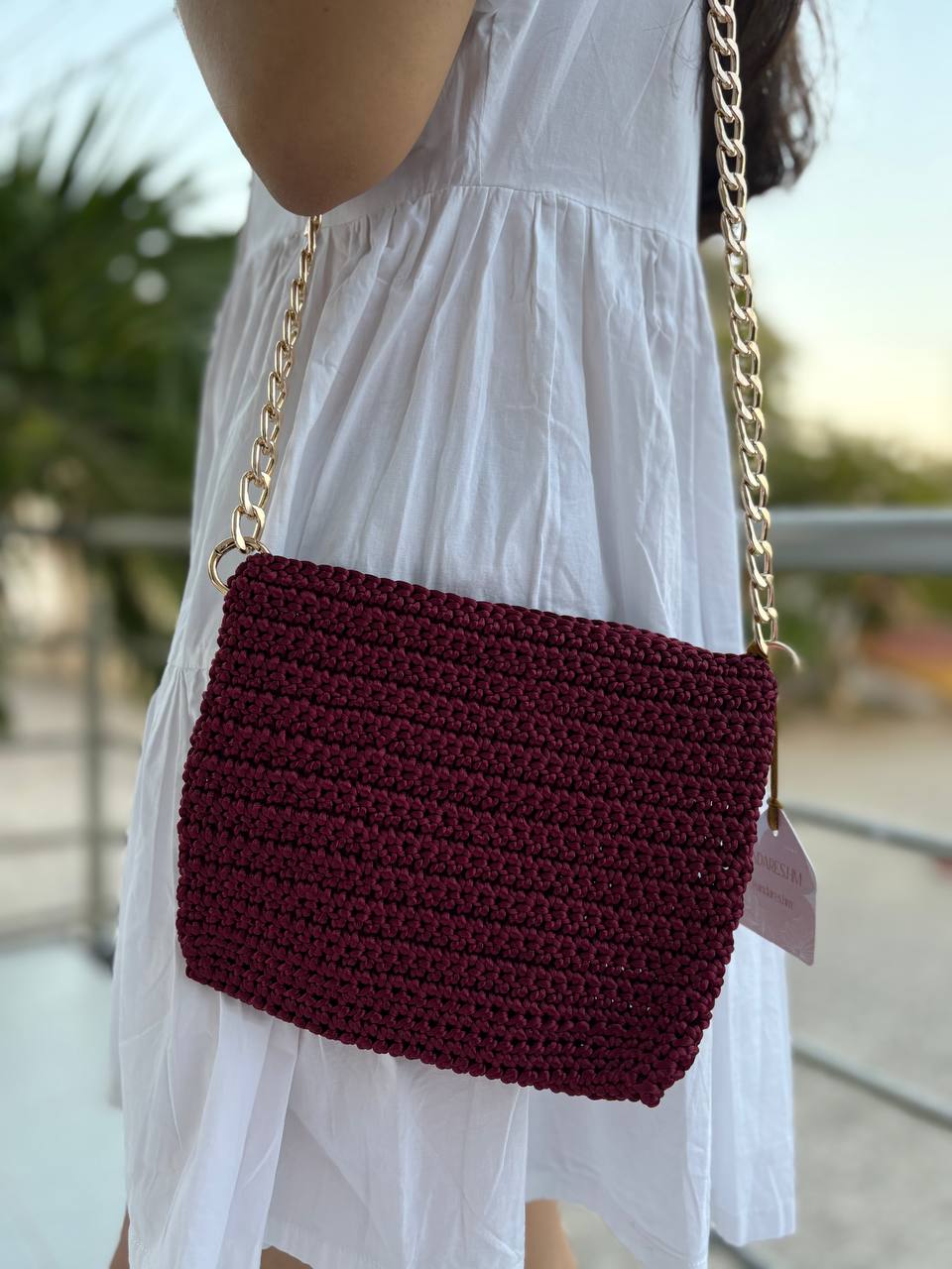 Perfecto para salidas casuales o eventos especiales, puede complementarse con cadena dorada o asa de aros tejida.